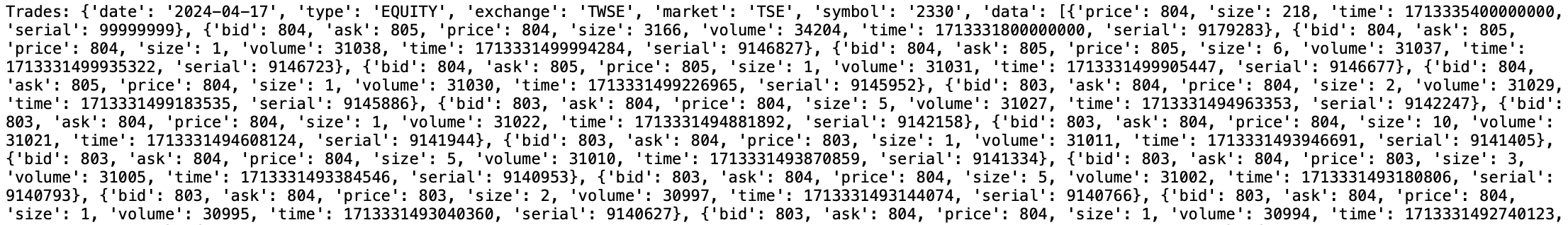 Trades: {'date': '2024-04-17', 'type': 'EQUITY', 'exchange': 'TWSE', 'market': 'TSE', 'symbol': '2330', 'data': [{'price': 804, 'size': 218, 'time': 1713335400000000, 'serial': 99999999}, {'bid': 804, 'ask': 805, 'price': 804, 'size': 3166, 'volume': 34204, 'time': 1713331800000000, 'serial': 9179283}, {'bid': 804, 'ask': 805, 'price': 804, 'size': 1, 'volume': 31038, 'time': 1713331499994284, 'serial': 9146827}, {'bid': 804, 'ask': 805, 'price': 805, 'size': 6, 'volume': 31037, 'time': 1713331499935322, 'serial': 9146723}, {'bid': 804, 'ask': 805, 'price': 805, 'size': 1, 'volume': 31031, 'time': 1713331499905447, 'serial': 9146677}, {'bid': 804, 'ask': 805, 'price': 804, 'size': 1, 'volume': 31030, 'time': 1713331499226965, 'serial': 9145952}, {'bid': 803, 'ask': 804, 'price': 804, 'size': 2, 'volume': 31029, 'time': 1713331499183535, 'serial': 9145886}, {'bid': 803, 'ask': 804, 'price': 804, 'size': 5, 'volume': 31027, 'time': 1713331494963353, 'serial': 9142247}, {'bid': 803, 'ask': 804, 'price': 804, 'size': 1, 'volume': 31022, 'time': 1713331494881892, 'serial': 9142158}, {'bid': 803, 'ask': 804, 'price': 804, 'size': 10, 'volume': 31021, 'time': 1713331494608124, 'serial': 9141944}, {'bid': 803, 'ask': 804, 'price': 803, 'size': 1, 'volume': 31011, 'time': 1713331493946691, 'serial': 9141405}, {'bid': 803, 'ask': 804, 'price': 804, 'size': 5, 'volume': 31010, 'time': 1713331493870859, 'serial': 9141334}, {'bid': 803, 'ask': 804, 'price': 803, 'size': 3, 'volume': 31005, 'time': 1713331493384546, 'serial': 9140953}, {'bid': 803, 'ask': 804, 'price': 804, 'size': 5, 'volume': 31002, 'time': 1713331493180806, 'serial': 9140793}, {'bid': 803, 'ask': 804, 'price': 803, 'size': 2, 'volume': 30997, 'time': 1713331493144074, 'serial': 9140766}, {'bid': 803, 'ask': 804, 'price': 804, 'size': 1, 'volume': 30995, 'time': 1713331493040360, 'serial': 9140627}, {'bid': 803, 'ask': 804, 'price': 804, 'size': 1, 'volume': 30994, 'time': 1713331492740123, 'serial': 9140386}, {'bid': 803, 'ask': 804, 'price': 803, 'size': 6, 'volume': 30993, 'time': 1713331492651710, 'serial': 9140320}, {'bid': 803, 'ask': 804, 'price': 803, 'size': 1, 'volume': 30987, 'time': 1713331492566815, 'serial': 9140243}, {'bid': 803, 'ask': 804, 'price': 804, 'size': 5, 'volume': 30986, 'time': 1713331492371117, 'serial': 9140099}, {'bid': 803, 'ask': 804, 'price': 804, 'size': 2, 'volume': 30981, 'time': 1713331491580217, 'serial': 9139475}, {'bid': 803, 'ask': 804, 'price': 804, 'size': 1, 'volume': 30979, 'time': 1713331490679715, 'serial': 9138672},...]}