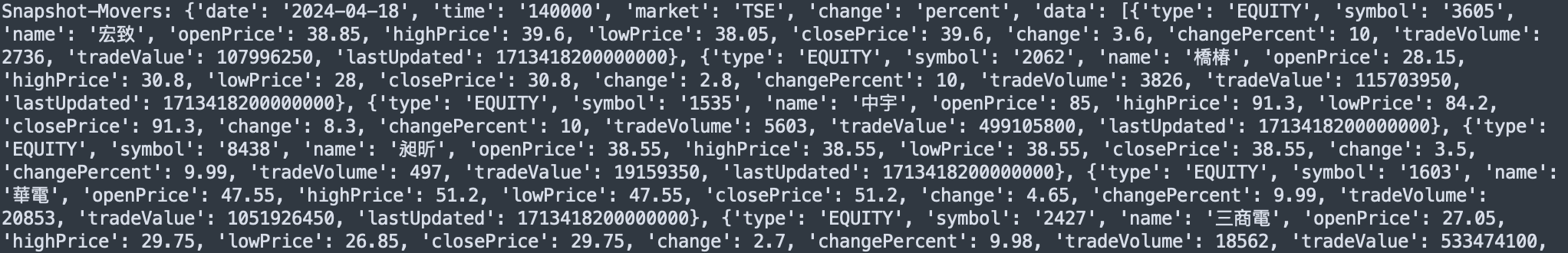 Snapshot-Movers: {'date': '2024-04-18', 'time': '140000', 'market': 'TSE', 'change': 'percent', 'data': [{'type': 'EQUITY', 'symbol': '3605', 'name': '宏致', 'openPrice': 38.85, 'highPrice': 39.6, 'lowPrice': 38.05, 'closePrice': 39.6, 'change': 3.6, 'changePercent': 10, 'tradeVolume': 2736, 'tradeValue': 107996250, 'lastUpdated': 1713418200000000}, {'type': 'EQUITY', 'symbol': '2062', 'name': '橋椿', 'openPrice': 28.15, 'highPrice': 30.8, 'lowPrice': 28, 'closePrice': 30.8, 'change': 2.8, 'changePercent': 10, 'tradeVolume': 3826, 'tradeValue': 115703950, 'lastUpdated': 1713418200000000}, {'type': 'EQUITY', 'symbol': '1535', 'name': '中宇', 'openPrice': 85, 'highPrice': 91.3, 'lowPrice': 84.2, 'closePrice': 91.3, 'change': 8.3, 'changePercent': 10, 'tradeVolume': 5603, 'tradeValue': 499105800, 'lastUpdated': 1713418200000000}, {'type': 'EQUITY', 'symbol': '8438', 'name': '昶昕', 'openPrice': 38.55, 'highPrice': 38.55, 'lowPrice': 38.55, 'closePrice': 38.55, 'change': 3.5, 'changePercent': 9.99, 'tradeVolume': 497, 'tradeValue': 19159350, 'lastUpdated': 1713418200000000}, {'type': 'EQUITY', 'symbol': '1603', 'name': '華電', 'openPrice': 47.55, 'highPrice': 51.2, 'lowPrice': 47.55, 'closePrice': 51.2, 'change': 4.65, 'changePercent': 9.99, 'tradeVolume': 20853, 'tradeValue': 1051926450, 'lastUpdated': 1713418200000000}, {'type': 'EQUITY', 'symbol': '2427', 'name': '三商電', 'openPrice': 27.05, 'highPrice': 29.75, 'lowPrice': 26.85, 'closePrice': 29.75, 'change': 2.7, 'changePercent': 9.98, 'tradeVolume': 18562, 'tradeValue': 533474100, 'lastUpdated': 1713418200000000}, {'type': 'EQUITY', 'symbol': '6230', 'name': '尼得科超眾', 'openPrice': 226, 'highPrice': 226, 'lowPrice': 226, 'closePrice': 226, 'change': 20.5, 'changePercent': 9.98, 'tradeVolume': 451, 'tradeValue': 101926000, 'lastUpdated': 1713418200000000},...]}