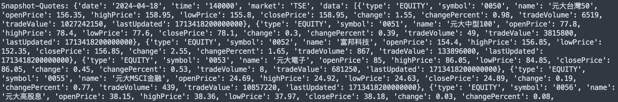 Snapshot-Quotes: {'date': '2024-04-18', 'time': '140000', 'market': 'TSE', 'data': [{'type': 'EQUITY', 'symbol': '0050', 'name': '元大台灣50', 'openPrice': 156.35, 'highPrice': 158.95, 'lowPrice': 155.8, 'closePrice': 158.95, 'change': 1.55, 'changePercent': 0.98, 'tradeVolume': 6519, 'tradeValue': 1027242150, 'lastUpdated': 1713418200000000}, {'type': 'EQUITY', 'symbol': '0051', 'name': '元大中型100', 'openPrice': 77.8, 'highPrice': 78.4, 'lowPrice': 77.6, 'closePrice': 78.1, 'change': 0.3, 'changePercent': 0.39, 'tradeVolume': 49, 'tradeValue': 3815800, 'lastUpdated': 1713418200000000}, {'type': 'EQUITY', 'symbol': '0052', 'name': '富邦科技', 'openPrice': 154.4, 'highPrice': 156.85, 'lowPrice': 152.35, 'closePrice': 156.85, 'change': 2.55, 'changePercent': 1.65, 'tradeVolume': 867, 'tradeValue': 133896000, 'lastUpdated': 1713418200000000}, {'type': 'EQUITY', 'symbol': '0053', 'name': '元大電子', 'openPrice': 85, 'highPrice': 86.05, 'lowPrice': 84.85, 'closePrice': 86.05, 'change': 0.45, 'changePercent': 0.53, 'tradeVolume': 8, 'tradeValue': 681250, 'lastUpdated': 1713418200000000}, {'type': 'EQUITY', 'symbol': '0055', 'name': '元大MSCI金融', 'openPrice': 24.69, 'highPrice': 24.92, 'lowPrice': 24.63, 'closePrice': 24.89, 'change': 0.19, 'changePercent': 0.77, 'tradeVolume': 439, 'tradeValue': 10857220, 'lastUpdated': 1713418200000000}, {'type': 'EQUITY', 'symbol': '0056', 'name': '元大高股息', 'openPrice': 38.15, 'highPrice': 38.36, 'lowPrice': 37.97, 'closePrice': 38.18, 'change': 0.03, 'changePercent': 0.08, 'tradeVolume': 57649, 'tradeValue': 2200785540, 'lastUpdated': 1713418200000000}, ...}